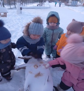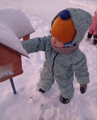 Выйдя на прогулку, ребята группы «Пчелки», взяли с собой хлеб, подошли к птичьей столовой, рассмотрели кормушки, провели наблюдение за птицами, повторили имитирующие движения руками "Как птички машут крыльями" и каждый ребенок положил в кормушки крошечки хлеба.
